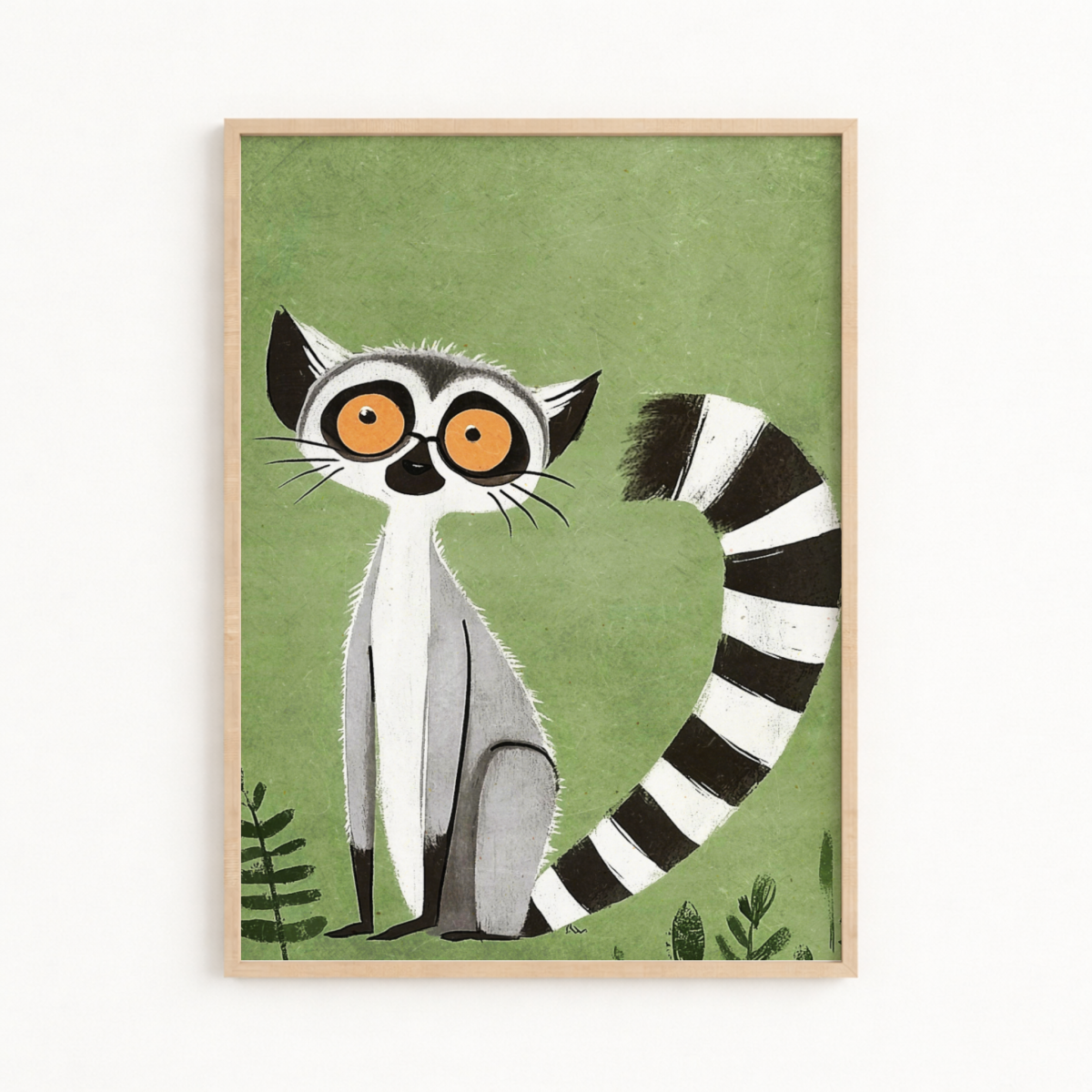 Забавна илюстрация на лемур с големи очи и впечатляваща раирана опашка, разположена върху свеж зелен фон с органична текстура. Този дизайн внася характер и чувство за откривателство във всяко пространство, като съчетава модерен художествен стил с приветливо излъчване.